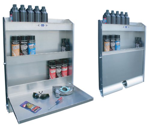 RB Components Door Cabinet Large?Equipped with shelves to hold oil, large containers, & aerosol on all 3 levels. RB also reduced the depth of the cabinet for those tight spaces by moving the paper towel holder to the bottom of the cabinet & provided the option to have an open or full back for your cabinet. Upper shelf holds 9 oil containers. Middle & lower shelves hold mulitple assortments of aerosol, oil or large containers. Dimensions: 31.75"H x 5.5"D x 25"W. Great way to organize enclosed trailers or shops.